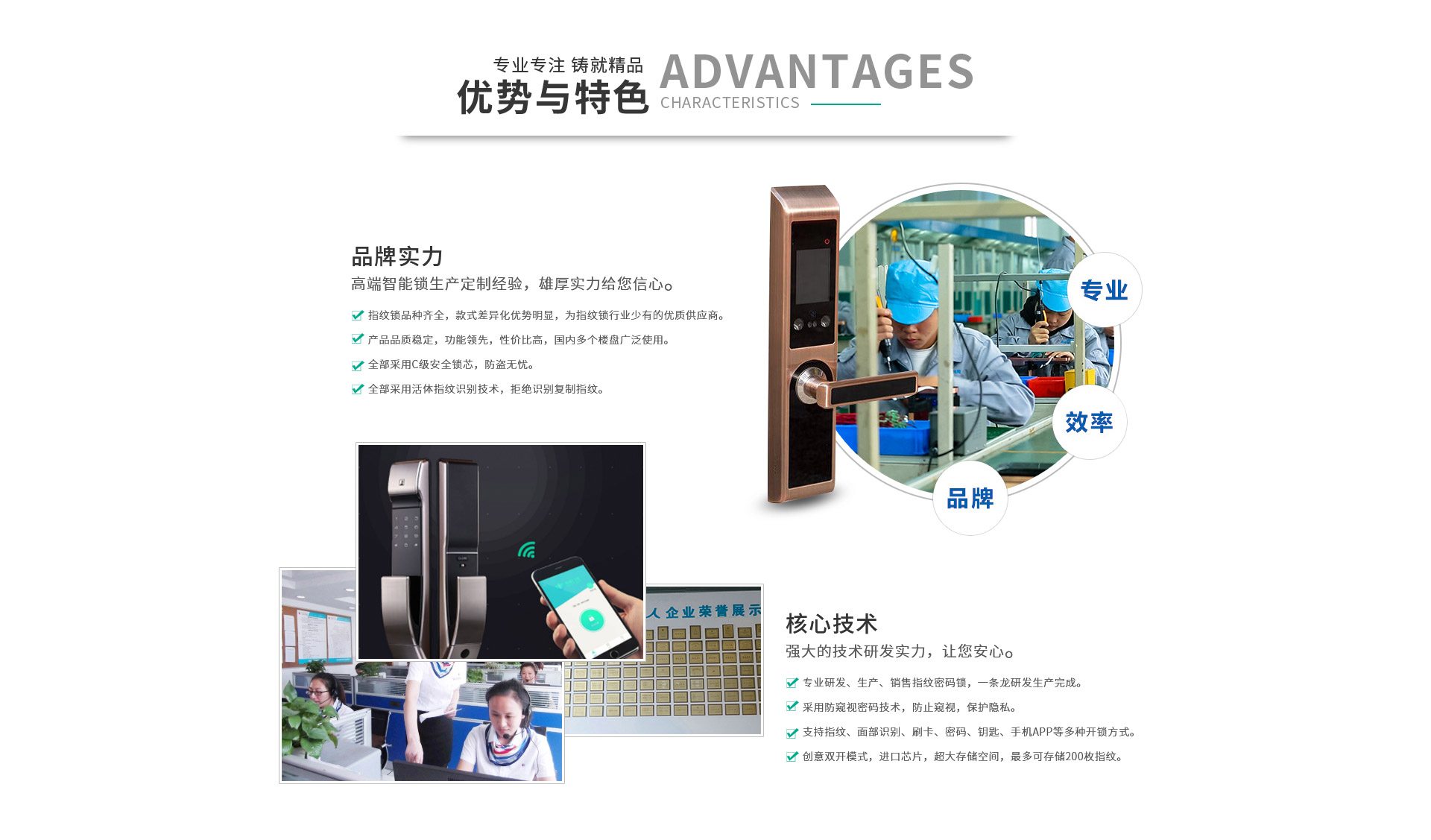 自公司创立以来,一直坚持自主研发、生产制造、经营销售一体化的企业发展道路,公司以“关爱居住环境,提升生活品质”为企业发展的基点,凭借雄厚的实力,先进的生产技术,立足市场,面向高端用户,致力各种安全门和智能锁的创研和制造。